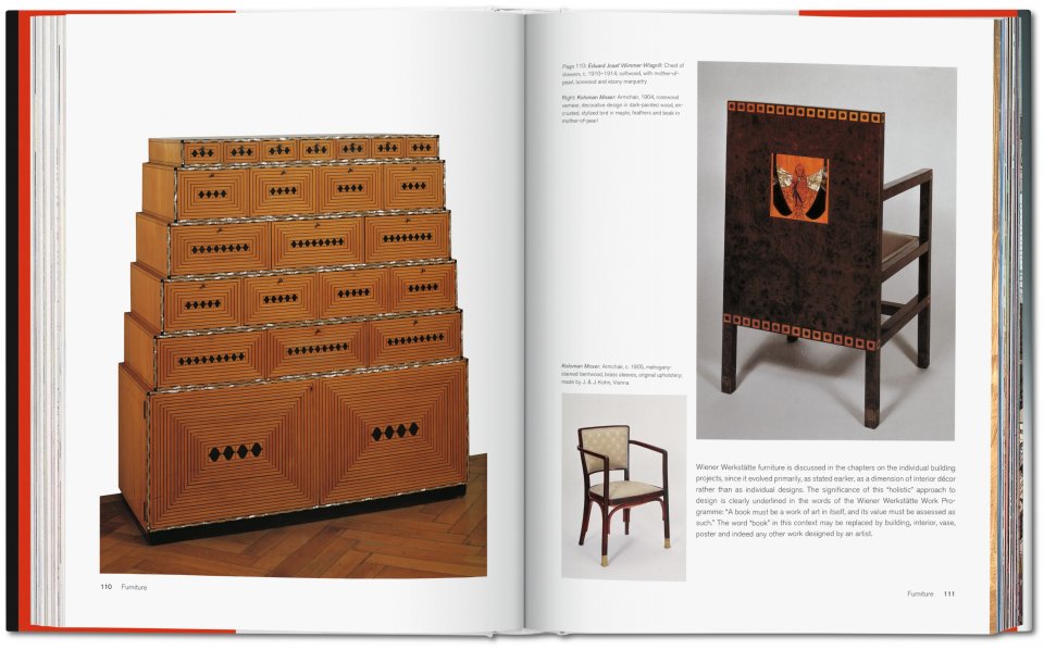 The workshop began life in three small rooms, but soon expanded to fill a three storey building with special departments for metalwork, leatherwork, and woodwork, as well as a book binder and a paint shop. Artists experimented with various materials such as gold, precious stones, and papier mâché and applied their simple, often geometric, designs across ceramics, textiles, typography, interior design, furniture, and fashion. In architectural commissions such as the Purkersdorf Sanatorium and the Palais Stoclet in Brussels, the group was able to realize its ideal of the Gesamtkunstwerk (¡°total artwork¡±), in which every detail of an environment was designed as an integral part of a coordinated whole.