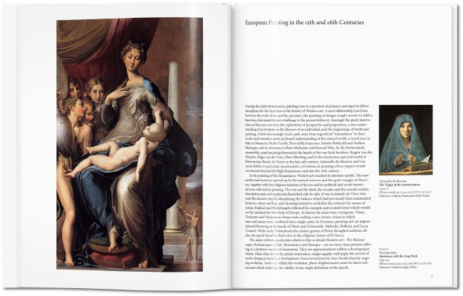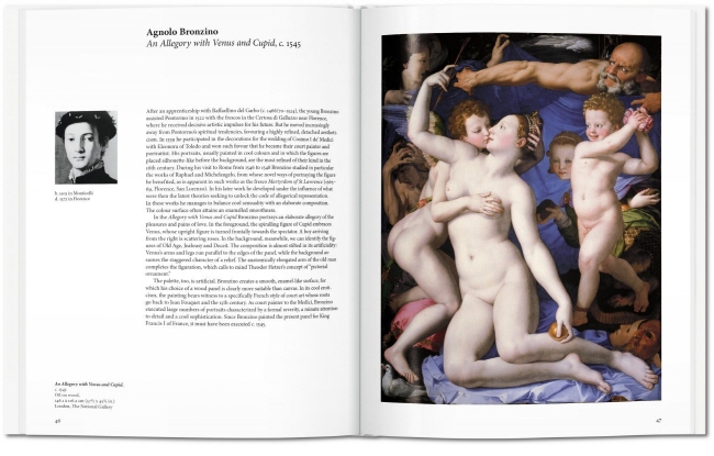 Featured artists include: Fra Angelico, Giovanni Bellini, Hieronymus Bosch, Sandro Botticelli, Pieter Brueghel, Lucas Cranach the Elder, Albrecht Dürer, El Greco, Matthias Grünewald, Hans Holbein the Younger, Fra Filippo Lippi, Masaccio, Michelangelo, Pontormo, Raphael, Tintoretto, Titian, Paolo Uccello, Veronese, and Leonardo da Vinci.