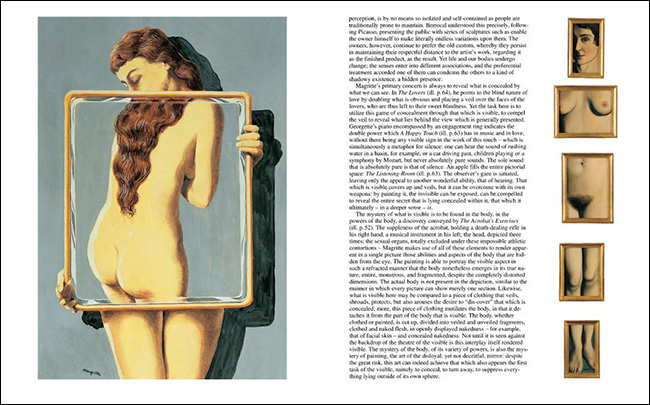 Çö´ë ¹Ì¼úÀ» ³íÇÏ´Â µ¥ ¸£³× ¸¶±×¸®Æ®(1898-1967)ÀÇ ¿µÇâ·ÂÀ» °£°úÇÒ ¼ö´Â ¾ø´Ù. ÃÊÇö½ÇÁÖÀÇÀû ÀÛǰÀº »ç¹°ÀÇ Áú¼¸¦ ±×ÀÇ ¸Ó¸´¼Ó¿¡¼ ¹Ý¾îÀûÀ¸·Î Ç®¾î³½ °ÍÀ¸·Î, ¸¶·ÂÀ» »ó½ÇÇÑ ¼¼»óÀÇ ¹Ì½ºÅ׸®¸¦ ȸº¹ÇϰíÀÚ ÇÑ´Ù. ±×ÀÇ ÀÛǰÀº ÀϹÝÀûÀ¸·Î °¨Åº, ³î¶ó¿ò ±×¸®°í Àͻ콺·¯¿ò »Ó¸¸ ¾Æ´Ï¶ó ºÒ¾ÈÁ¤ÇÑ ´À³¦À» Àü´ÞÇÑ´Ù. ±¸Ã¼ÀûÀÎ ¸Þ½ÃÁö°¡ ¾øÀ½¿¡µµ ºÒ±¸Çϰí, ¸¶±×¸®Æ®ÀÇ ±×¸²Àº Á¤¹Ý´ëµÇ´Â ±Ø°ú ±ØÀÇ °ü°è¸¦ âÁ¶Çس»¸é¼, ¿ì¸®¿¡°Ô ¹«¾ð°¡¸¦ Àü´ÞÇϰíÀÚ ÇÑ´Ù. ¿Ïº®ÇÑ ÀÚ¿¬½º·¯¿òÀ¸·Î, µð³Ê ·ÑÀÌ ºøÀ幫´ÌÀÇ ÁöÇϰ¨¿Á ¹®À» ºü¸£°Ô Áö³ª°£´Ù. ¸¶±×¸®Æ®´Â ÀÚ½ÅÀÇ ÀÛ¾÷¿¡ ´ëÇØ À̾߱âÇϸç, "¿µ°¨ ¹ÞÀº »ý°¢µé"À» À̾߱âÇß´Ù. ±×´Â ÁøÁ¤ÇÑ ¹Ì¼ú°¡-öÇÐÀÚ¿´´Ù. ±×´Â ȸÈÀûÀÎ ÇüŸ¦ °¡Áö°í »çÀ¯Çϰí, °íÂ÷¿øÀûÀÎ »ó»ó ¼Ó¿¡¼ À峱⠸¹Àº °¡º¿òÀ» ³ì¿©³Â´Ù.