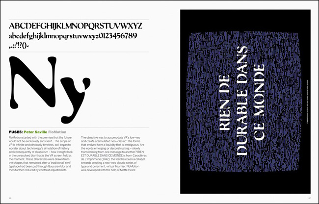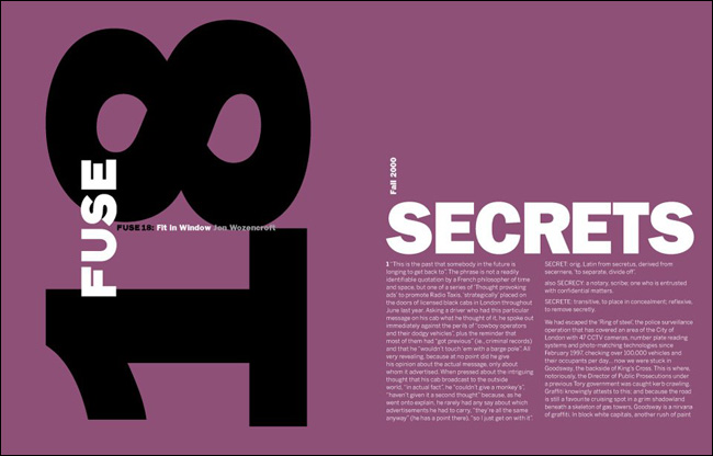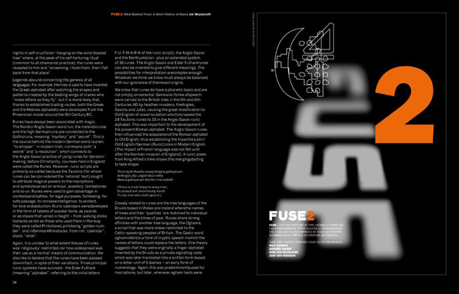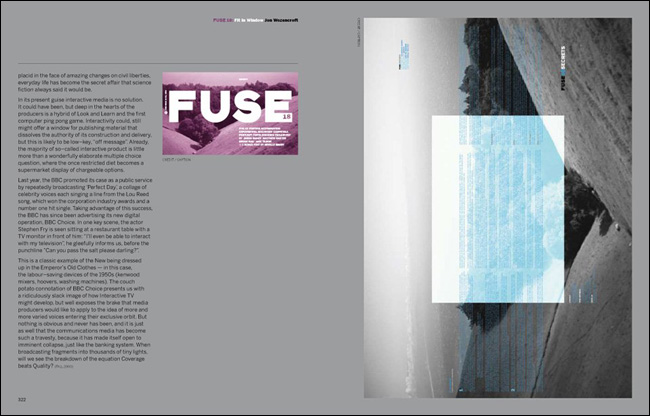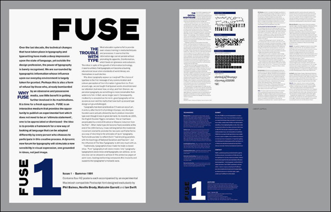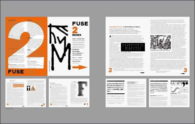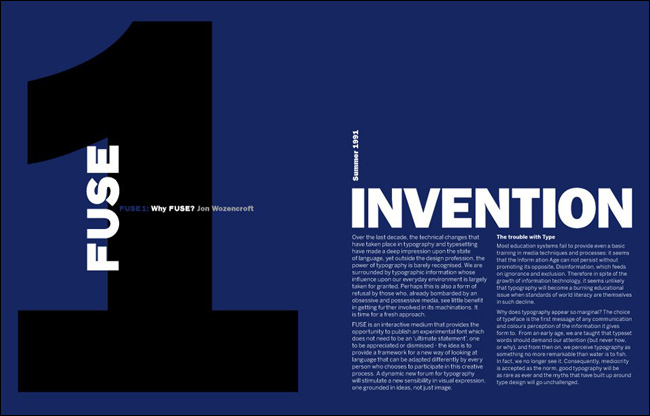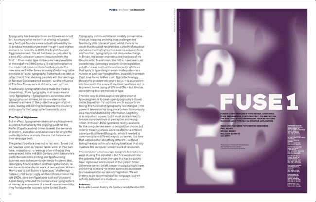 1991³â ³×ºô ºê·Îµð(Neville Brody)¿Í Á¸ ¿öÁ¨Å©·ÎÇÁÆ®(Jon Wozencroft)¿¡ ÀÇÇØ ¹ß°£µÈ ÀâÁö <Ç»Áî(FUSE)>´Â µðÀÚÀΰú ŸÀÌÆ÷±×·¡ÇǸ¦ ¶æ¹ÛÀÇ °ø°£À¸·Î ±ÞÁøÀûÀ¸·Î À̲ø¾î°¡´Â Çõ½ÅÀûÀÎ ÃâÆÇ¹°À̾ú´Ù. ½ÇÇèÀûÀ̸ç Çõ¸íÀûÀÎ Á¢±ÙÀ» º¸¿©ÁÖ¾ú´ø ±×µéÀÇ ÀÛ¾÷ ¹ÝÇâÀº ÀâÁö ¹ß°£ ÈÄ 20³âÀ̶ó´Â ¼¼¿ùÀÌ È帥 ¿À´Ã³¯±îÁöµµ Áö¼ÓµÇ°í ÀÖÀ¸¸ç, ½Ã´ë¸¦ ¾Õ¼³ª°£ ÁøÃëÀûÀΠȰµ¿À¸·Î¼ ³Î¸® ±â¾ïµÇ°í ÀÖ´Ù.